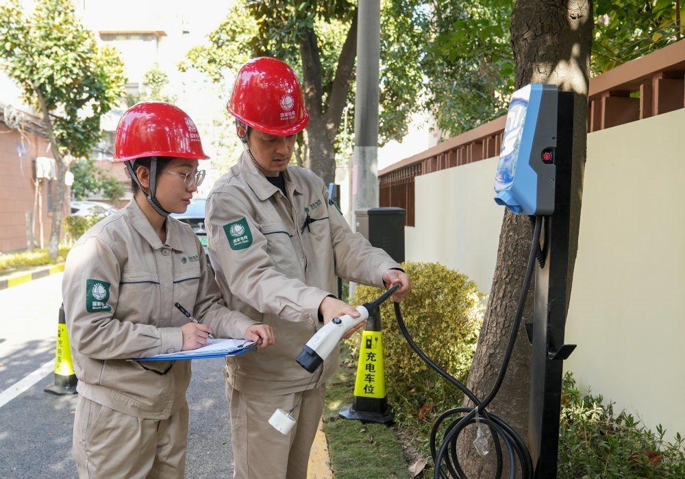 2023年11月29日,在上海市徐匯區(qū)田林十三村小區(qū)內(nèi),國網(wǎng)上海市南供電公司的工作人員在檢查充電樁運(yùn)行情況。新華社記者 丁汀 攝