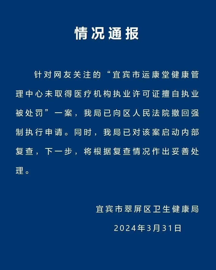 央視網(wǎng)消息:據(jù)宜賓市翠屏區(qū)衛(wèi)生健康局發(fā)布情況通報(bào),3月31日,針對(duì)網(wǎng)友關(guān)注的“宜賓市運(yùn)康堂健康管理中心未取得醫(yī)療機(jī)構(gòu)執(zhí)業(yè)許可證擅自執(zhí)業(yè)被處罰”一案,宜賓市翠屏區(qū)衛(wèi)生健康局已向區(qū)人民法院撤回強(qiáng)制執(zhí)行申請(qǐng)。同時(shí),宜賓市翠屏區(qū)衛(wèi)生健康局已對(duì)該案啟動(dòng)內(nèi)部復(fù)查,下一步,將根據(jù)復(fù)查情況作出妥善處理。