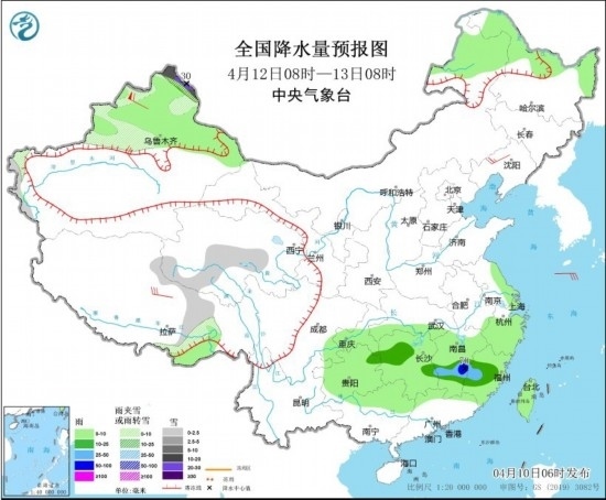 4月12日08時至13日08時,新疆北疆北部和沿天山地區(qū)、西藏東部、青海南部等地部分地區(qū)有小到中雪或雨夾雪,其中,新疆北疆北部的部分地區(qū)有大到暴雪,局地大暴雪(20~30毫米)。貴州西北部、湖南中部、江西中部、福建中部等地部分地區(qū)有中到大雨,其中,江西東部的部分地區(qū)有暴雨(50~70毫米)。新疆南疆盆地、西藏北部、遼寧西部等地部分地區(qū)有4~6級風,其中,新疆北疆北部部分地區(qū)有8~9級風;渤海、渤海海峽、黃海大部海域部分海域?qū)⒂?~7級。