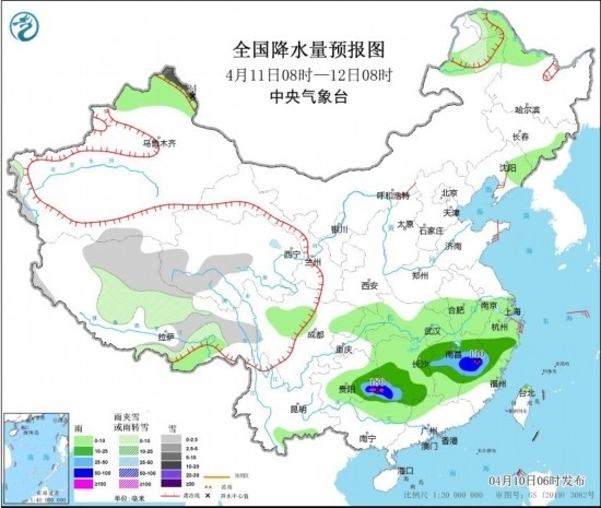 4月11日08時至12日08時,內(nèi)蒙古東北部、西藏中東部、青海南部、新疆北疆北部等地部分地區(qū)有小到中雪或雨夾雪,其中,新疆北疆北部和北疆東部等地部分地區(qū)有大到暴雪,局地大暴雪(20~24毫米)。貴州東南部、湖南中南部、江西中北部、浙江南部、福建北部、廣西北部等地部分地區(qū)有中到大雨,其中,貴州東南部、湖南西南部、江西東部、福建西北部、廣西東北部等地部分地區(qū)有暴雨或大暴雨(100~180毫米)。內(nèi)蒙古中部、遼東半島、山東半島、浙江北部等地部分地區(qū)有4~5級風;渤海、渤海海峽、黃海大部海域部分海域?qū)⒂?~7級、陣風8級的風。