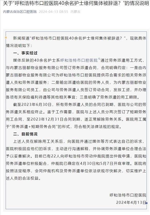 新聞報(bào)道“呼和浩特市口腔醫(yī)院40余名護(hù)士緣何集體被辭退?”,現(xiàn)就具體情況說明如下: