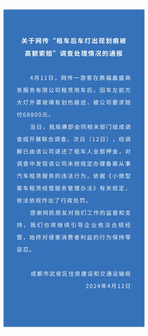 ·官方通報(bào)男子在成都遭遇“提燈驗(yàn)車(chē)”:已退還押金,涉事租車(chē)公司被行政處罰。