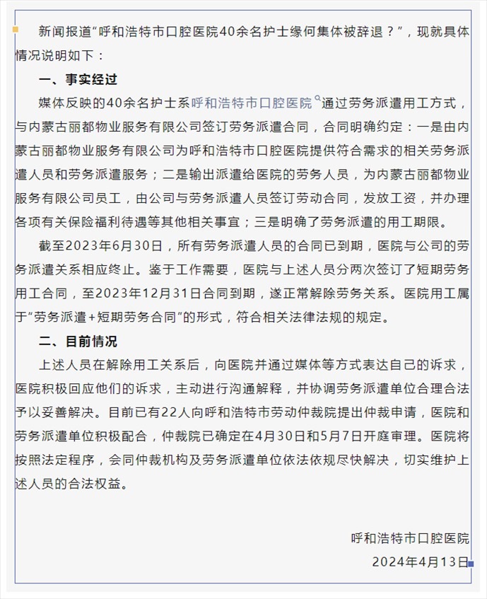 ·40余名護(hù)士無(wú)故被辭退?呼和浩特市口腔醫(yī)院發(fā)布情況說(shuō)明。
