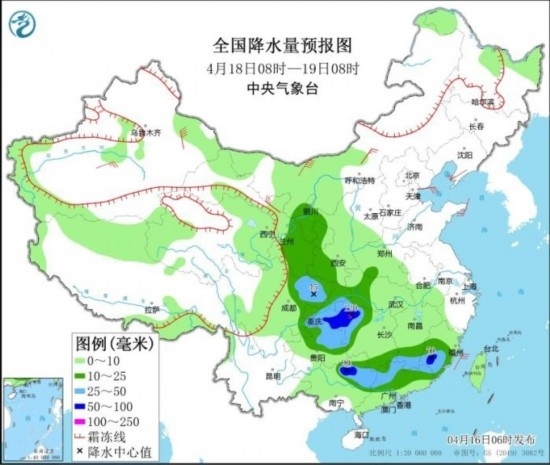 全國降水量預(yù)報圖(4月18日08時-19日08時)