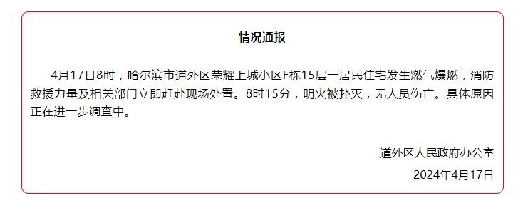 央視網(wǎng)消息:據(jù)“記憶道外”官微消息,哈爾濱市道外區(qū)人民政府辦公室發(fā)布情況通報(bào),4月17日8時(shí),哈爾濱市道外區(qū)榮耀上城小區(qū)F棟15層一居民住宅發(fā)生燃?xì)獗迹谰仍α考跋嚓P(guān)部門立即趕赴現(xiàn)場(chǎng)處置。8時(shí)15分,明火被撲滅,無(wú)人員傷亡。具體原因正在進(jìn)一步調(diào)查中。