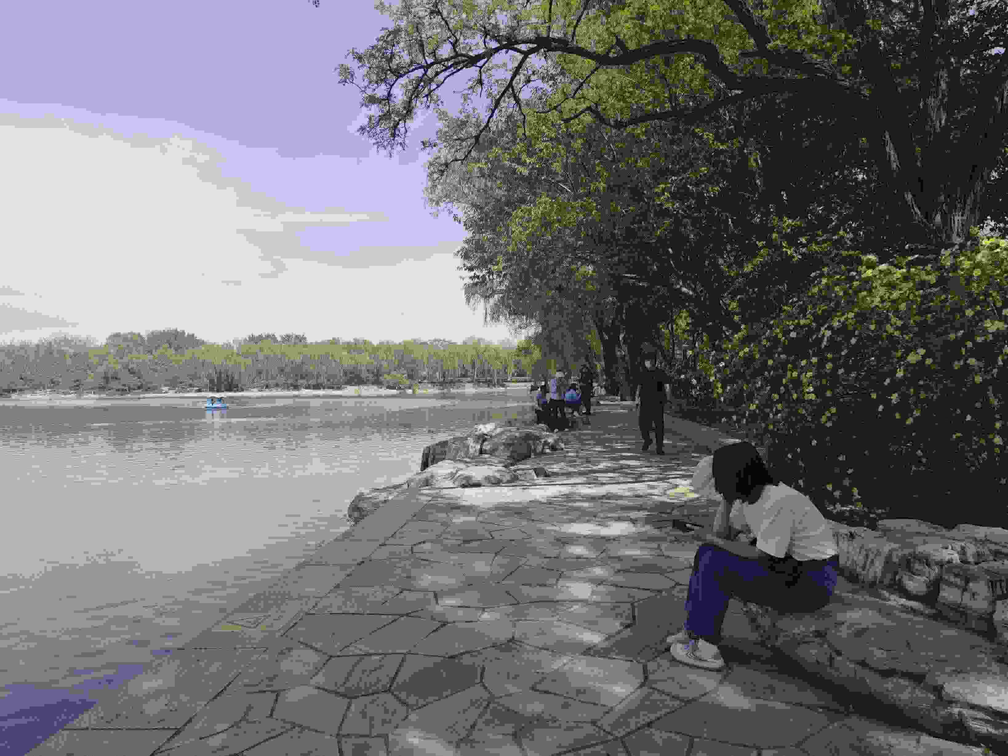 工作日午休時分的玉淵潭公園,也成了上班族的精神“快充站”。玉淵潭公園東湖旁,一排年輕人正悠閑地曬著太陽。眼前的湖面開闊平靜,微風拂面,頭頂垂柳依依,耳邊不時傳來清脆的鳥鳴聲。
