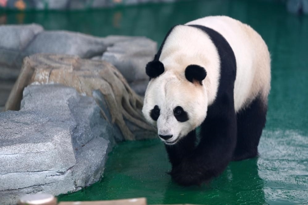 繼續(xù)前行進(jìn)入大熊貓2號館,便能看到園內(nèi)唯一的雌性大熊貓“曼蘭”。今年7歲的它“兩耳不聞窗外事”,疾步快走,不停地在館舍內(nèi)繞圈子。住在它隔壁的6歲雄性大熊貓“滿滿”則鏡頭感十足,當(dāng)游客拿出手機(jī)拍攝時,它趴在地上吐舌頭“賣萌”,不一會又變換姿勢,攀上木樁玩耍,吸引眾多游客紛紛按下快門,記錄它活潑可愛的一面。