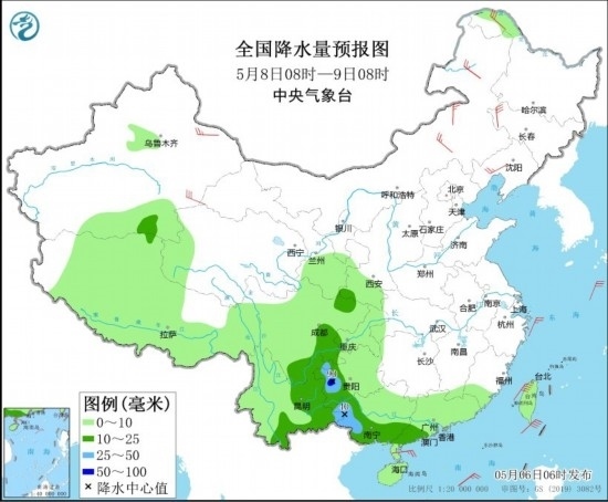 全國降水量預報圖(5月8日08時-9日08時)