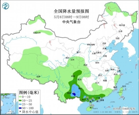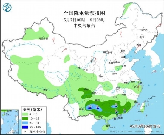 全國降水量預(yù)報圖(5月7日08時-8日08時)