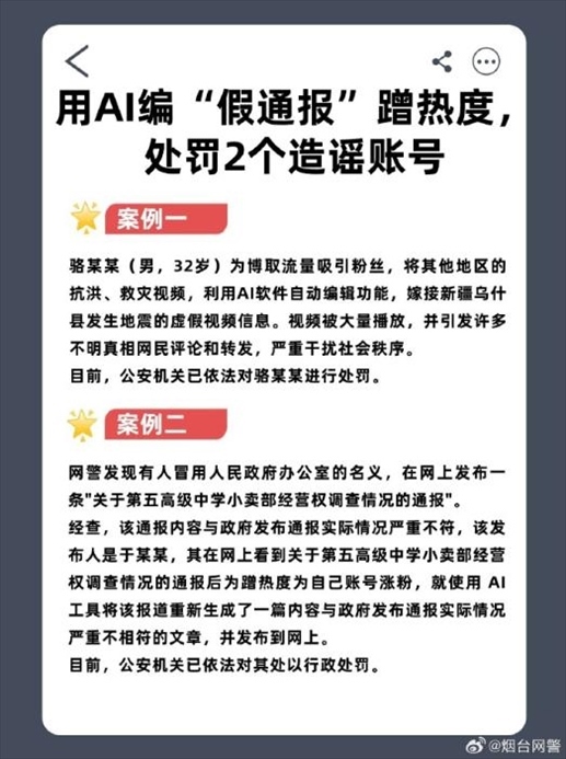 ·煙臺(tái)警方公布兩起“用AI編假通報(bào)蹭熱度”案例。