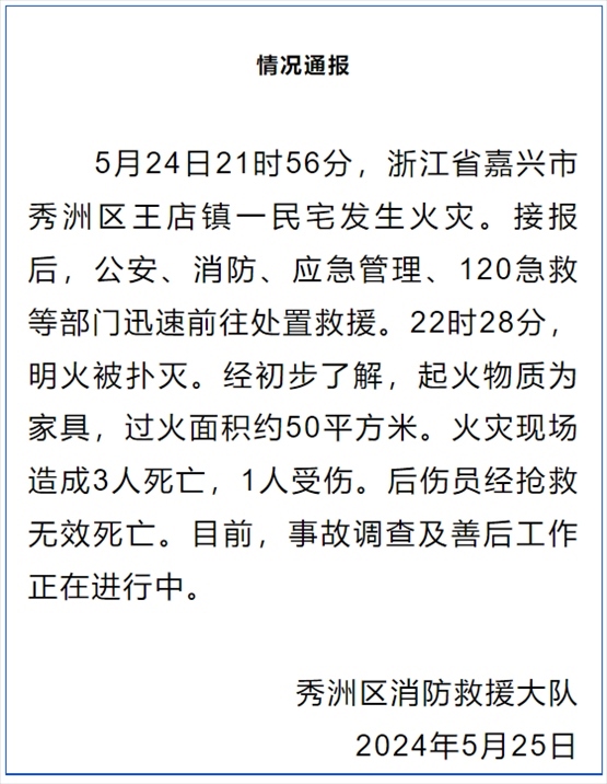 經(jīng)初步了解,起火物質(zhì)為家具,過(guò)火面積約50平方米。火災(zāi)現(xiàn)場(chǎng)造成3人死亡,1人受傷,后傷員經(jīng)搶救無(wú)效死亡。目前,事故調(diào)查及善后工作正在進(jìn)行中。