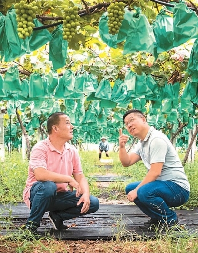 陳李波(右)在崇賢村葡萄種植園與農(nóng)戶一起察看葡萄長(zhǎng)勢(shì)。錢(qián)麗君攝