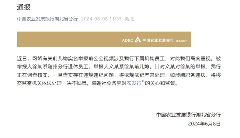 ·農(nóng)發(fā)行湖北分行通報“女子實(shí)名舉報前公公”:正調(diào)查核實(shí)。