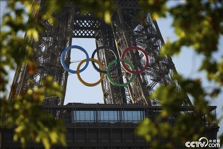 當(dāng)?shù)貢r間2024年6月7日,在巴黎奧運(yùn)會開幕倒計時50天之際,奧運(yùn)五環(huán)被安裝在巴黎埃菲爾鐵塔上。