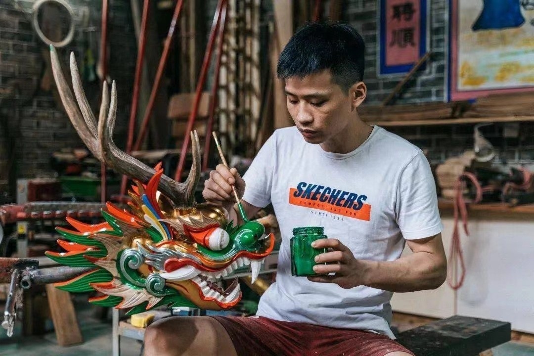 十五年間,張偉潮已記不清他雕刻或翻新了多少龍頭,同樣的刀銼雕鏤,卻是各不相同的勇猛威嚴(yán),慈眉善目。形態(tài)各異的龍頭之上,承載的是一個(gè)村落的鄉(xiāng)愁,一支隊(duì)伍的雄心,一方百姓的豪情。最初一家三口扛起的小作坊,也迎來了越來越多的年輕學(xué)徒。