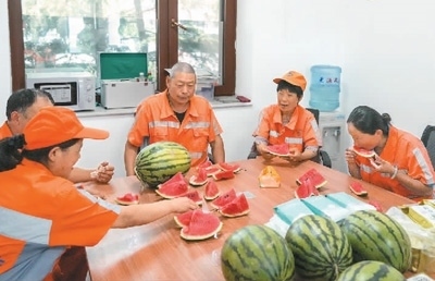 6月11日,山東省濟南市繼續(xù)發(fā)布高溫紅色預警信號。為應對持續(xù)高溫天氣,濟南市城管部門采取調(diào)整作業(yè)時間、配發(fā)防暑降溫物品、增加歇腳點等措施,保障環(huán)衛(wèi)工人健康。圖為環(huán)衛(wèi)工人在濟南市槐蔭區(qū)一處歇腳點內(nèi)休息。新華社記者 朱 崢攝