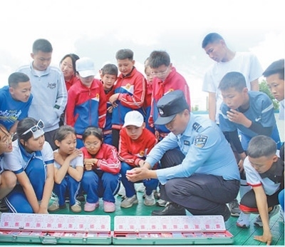 內(nèi)蒙古自治區(qū)通遼市科爾沁左翼后旗公安局禁毒大隊民警走進(jìn)該旗蒙古族實驗小學(xué),向?qū)W生們展示“笑氣”模型。周連龍攝