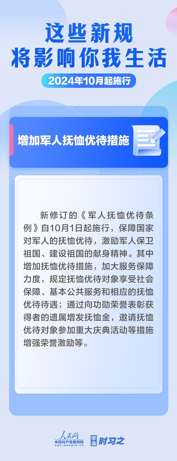 增加軍人撫恤優(yōu)待措施;全鏈條規(guī)范養(yǎng)老機(jī)構(gòu)收費(fèi)行為;電動(dòng)自行車(chē)用鋰電池實(shí)施強(qiáng)制性產(chǎn)品認(rèn)證……10月起,這些新規(guī)施行,將影響你我生活。
