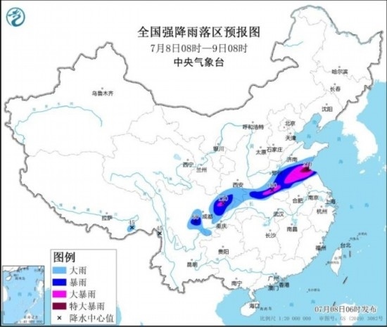 全國強(qiáng)降水落區(qū)預(yù)報(7月8日08時-9日08時)