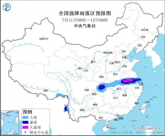 7月11日08時至12日08時,四川東北部、重慶中北部、湖北西部和北部、河南東南部、安徽中部、江蘇南部、上海以及西藏東南部、云南西部等地部分地區(qū)有大到暴雨,其中,安徽中部、江蘇西南部、重慶北部等地部分地區(qū)有大暴雨(100~170毫米)。內(nèi)蒙古東南部和西北部、黑龍江東部、新疆東部、浙江中北部等地部分地區(qū)有4~6級風(fēng),其中,新疆東部部分地區(qū)有6~7級風(fēng)。