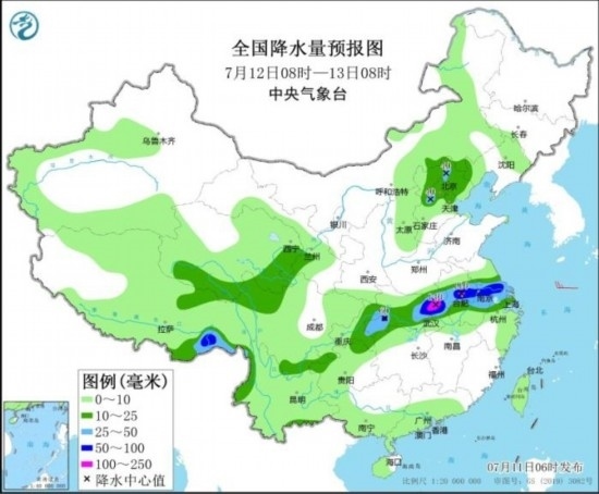全國降水量預(yù)報圖(7月12日08時-13日08時)