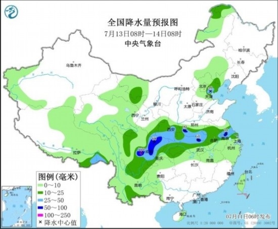 全國降水量預(yù)報圖(7月13日08時-14日08時)