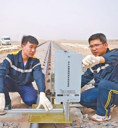 打開紅外線軸溫探測設(shè)備(THDS)的機蓋,映入眼簾的是一層厚厚的沙塵。臺欣龍熟練地拿出吹風(fēng)機、毛刷,仔細(xì)清理室外探頭箱里的沙塵,再把黑體(一種檢測設(shè)備)放置在探頭箱上,進行溫度檢測校準(zhǔn)。