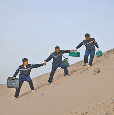 “今天這一路,算順利的?!迸_欣龍說,“假如某個檢測站發(fā)出故障警報,無論什么天氣,都必須立即響應(yīng)?!痹诹_布泊,沙塵暴說來就來,一刮就是三四個小時。有一回,他們遇上特大沙塵暴,風(fēng)暴像堵墻一樣迎面撲來。越野車迎風(fēng)的一側(cè),車漆幾乎全被風(fēng)沙打掉?!靶姨澑浇凶鶚蚝?,大伙兒在里頭躲了3個多小時?!憋L(fēng)暴過后,衣服上、頭發(fā)上、耳朵里、鼻孔里全都是沙子。一抬腳,鐵道路基上的風(fēng)沙已沒過膝蓋。