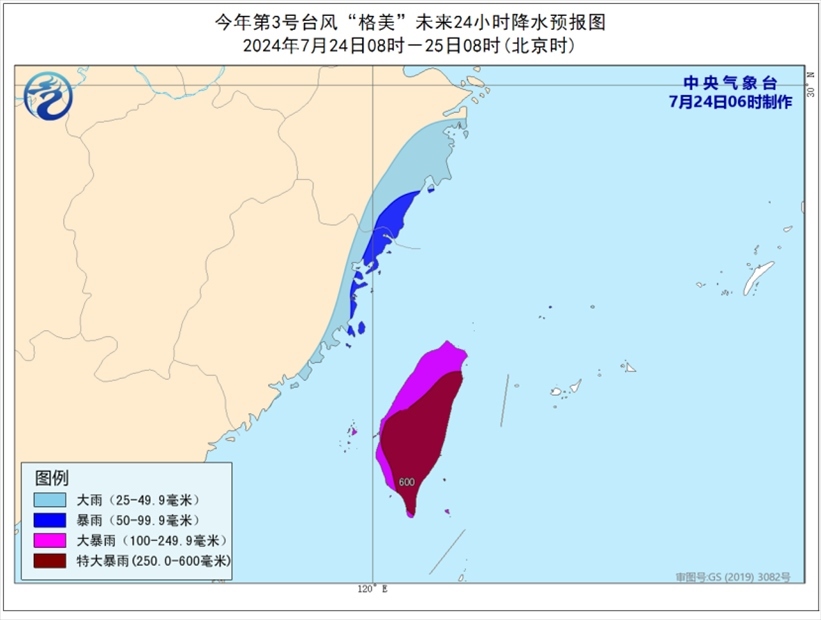 降水預(yù)報(bào):7月24日08時(shí)至25日08時(shí),浙江東南部、福建東部將有大到暴雨,臺(tái)灣島有大暴雨,部分地區(qū)特大暴雨(250-600毫米)。