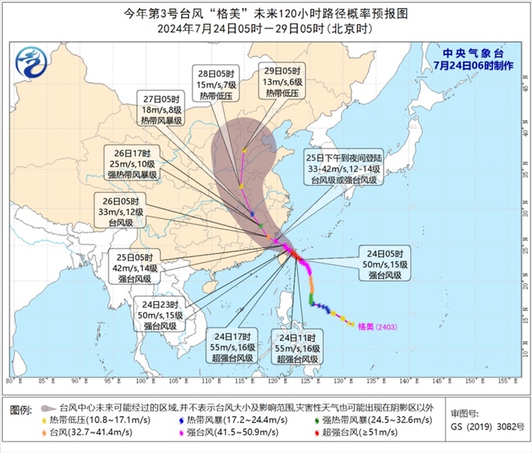 大風(fēng)預(yù)報(bào):7月24日08時(shí)至25日08時(shí),黃海西南部、東海大部及釣魚(yú)島附近海域、臺(tái)灣海峽、臺(tái)灣以東洋面、巴士海峽、南海大部、臺(tái)灣島沿海、浙江沿海、福建沿海、江蘇東南部沿海、上海沿海、長(zhǎng)江口區(qū)、杭州灣將有7-9級(jí)大風(fēng),其中東海南部及釣魚(yú)島附近海域、臺(tái)灣以東洋面、臺(tái)灣島東部和北部沿海、福建中北部沿海的風(fēng)力有10-12級(jí),“格美”中心經(jīng)過(guò)的附近海面或地區(qū)的風(fēng)力有13-16級(jí),陣風(fēng)17級(jí)以上。