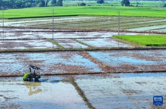 8月3日,衡東縣草市鎮(zhèn)村民駕駛農(nóng)機開展晚稻插秧工作(無人機照片)。