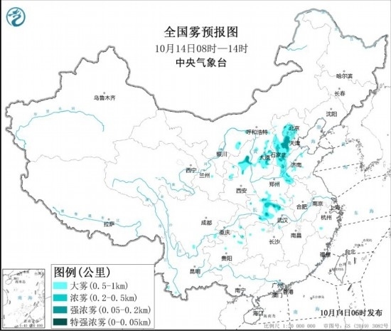 全國霧預(yù)報(bào)圖(10月14日8時-14時) 圖片來源:中央氣象臺網(wǎng)站