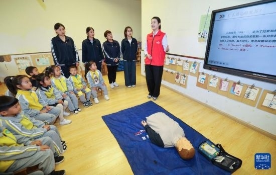 10月22日,國網(wǎng)浙江湖州供電公司“救”在身邊志愿服務(wù)隊的黨員志愿者梅月圓(右一)在長興縣開發(fā)區(qū)中心幼兒園開展應(yīng)急救護(hù)培訓(xùn)和急救知識普及。紅十字二級應(yīng)急救護(hù)師梅月圓是應(yīng)急救護(hù)培訓(xùn)志愿者,也是浙江省三八紅旗手。