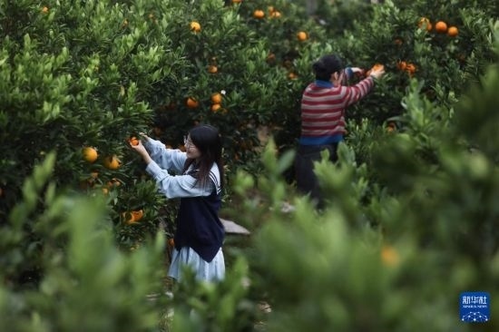 11月10日,在三都鎮(zhèn)柑橘種植基地,游客采摘柑橘。三都鎮(zhèn)柑橘種植面積達(dá)2.8萬(wàn)畝,總產(chǎn)量4.2萬(wàn)噸。