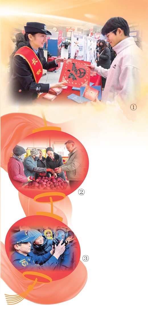 圖①:在吉林長春,鐵路公安民警為旅客送“?!弊?。