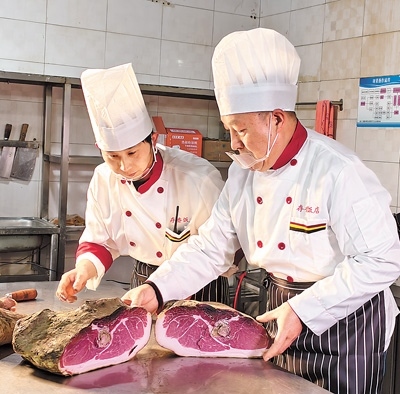宣威市存香飯店,大廚徐天勇正忙著挑選食材,而烏金豬是制作宣威火腿的最佳原料?!半缰七^程也很重要,鹽的比例要恰到好處,多一分則咸,少一分則不夠味,經(jīng)過兩三年發(fā)酵,火腿就可以達(dá)到生吃的標(biāo)準(zhǔn)了。”徐天勇用骨針輕輕插入火腿的上、中、下部,火腿肉質(zhì)清香撲鼻,“就是它了?!?/p>