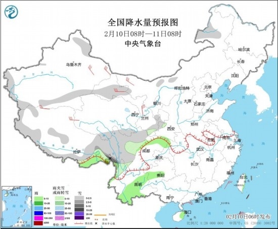 全國(guó)降水量預(yù)報(bào)圖(2月10日08時(shí)-11日08時(shí)) 圖片來(lái)源:中央氣象臺(tái)網(wǎng)站