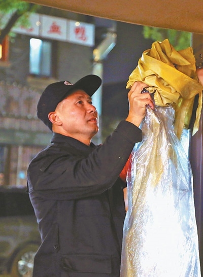 一場小雨后,執(zhí)法隊員幫助沿街店鋪撤收擋雨棚。