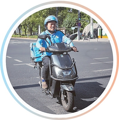 外賣(mài)騎手丁書(shū)會(huì)在送單途中。
