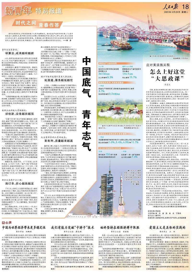 青年興則國家興,中國發(fā)展要靠廣大青年挺膺擔(dān)當(dāng)。面對復(fù)雜嚴峻的外部環(huán)境,廣大青年堅定信心、保持定力,集中精力辦好自己的事,不斷增強做中國人的志氣、骨氣、底氣,樹立為祖國為人民永久奮斗、赤誠奉獻的堅定理想。本期報道,我們聚焦來自不同行業(yè)奮戰(zhàn)在各自崗位的青年人,展現(xiàn)他們自信自強、剛健有為,為中國式現(xiàn)代化挺膺擔(dān)當(dāng)?shù)男拍钆c風(fēng)采。