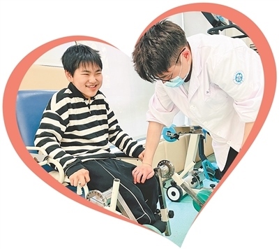 康復(fù)治療師正在為安安做腿部肌肉力量訓(xùn)練。
