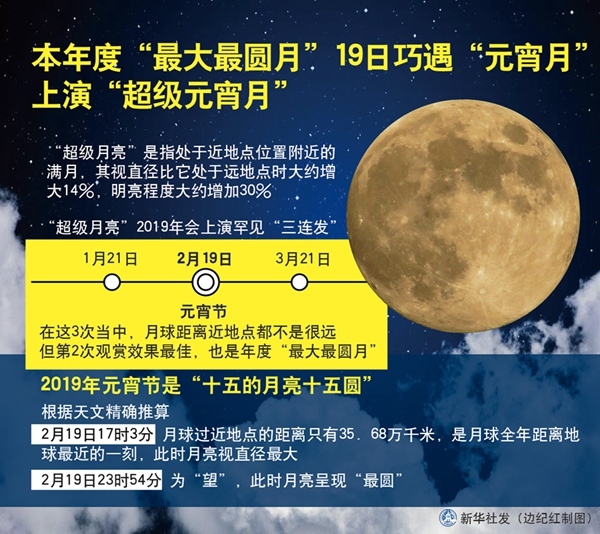“作為‘年度最大最圓月’,2019年的元宵月最圓時刻出現(xiàn)在正月十五23時54分,此時,接近子夜時分,元宵月也剛好升到正南方最高的位置,呈現(xiàn)出詩歌中所描述的‘皓月當(dāng)空’的美景。”天文教育專家、天津市天文學(xué)會理事趙之珩說。