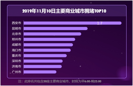 高德地圖對(duì)國內(nèi)20座重點(diǎn)商業(yè)城市的全天擁堵指數(shù)預(yù)測(cè)顯示,西安以相較平時(shí)周末增長8%的數(shù)字領(lǐng)跑全國,擁堵延時(shí)指數(shù)達(dá)到1.73,明顯超過排名第二的昆明,成為今年“天貓雙11”線下出行最為“火爆”的城市。