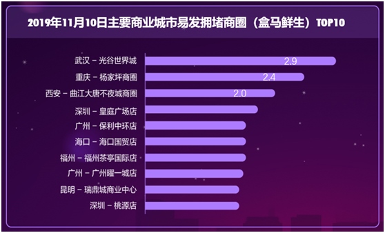 數(shù)據(jù)顯示,11月10日,盒馬鮮生所在區(qū)域易發(fā)生擁堵商圈排名前十位的依次是,武漢光谷世界城、重慶楊家坪、西安曲江大唐不夜城、深圳皇庭廣場(chǎng)店、廣州保利中環(huán)、??趪Q(mào)、福州茶亭國際、廣州曜一城、昆明瑞鼎城和深圳桃源。