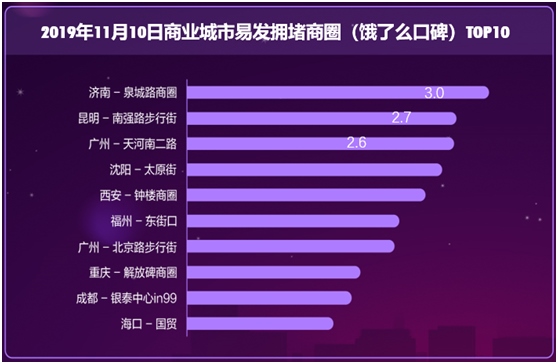 口碑餓了么線下商戶所在區(qū)域易發(fā)生擁堵商圈排名前十位的依次是,濟(jì)南泉城路、昆明南強(qiáng)步行街、廣州天河南二路、沈陽太原街、西安鐘樓、福州東街口、廣州北京路步行街、重慶解放碑、成都銀泰中心in99和??趪Q(mào)。