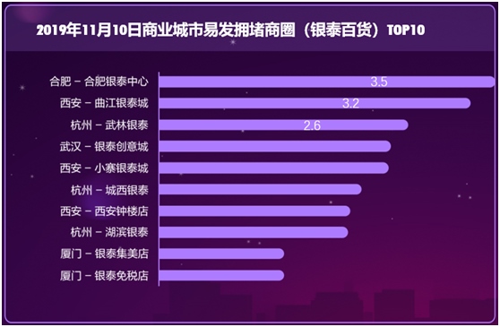 銀泰百貨所在商圈中前十位易發(fā)生擁堵的分別為合肥銀泰中心、西安曲江銀泰城、杭州武林銀泰、武漢銀泰創(chuàng)意城、西安小寨銀泰城、杭州城西銀泰、西安鐘樓銀泰、杭州湖濱銀泰、廈門銀泰集美店和廈門銀泰免稅店。