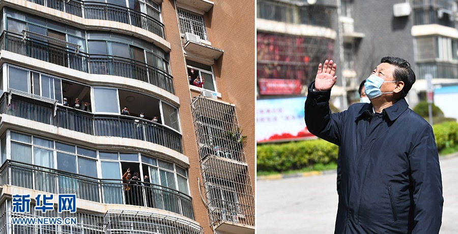 3月10日,習(xí)近平專門赴湖北省武漢市考察新冠肺炎疫情防控工作。這是習(xí)近平在東湖新城社區(qū)考察時(shí),向在家隔離居住的居民揮手致意、表示慰問(拼版照片)。