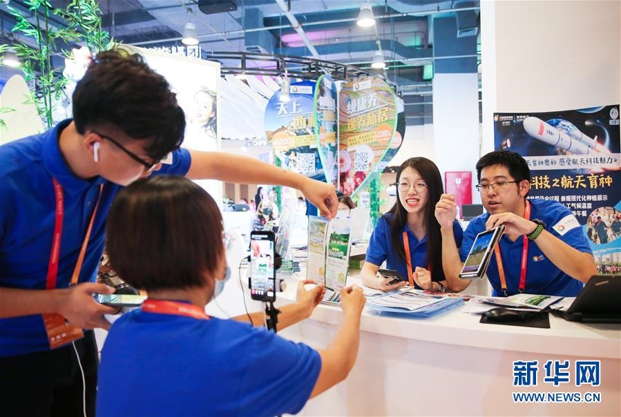 在2020年中國國際服務貿易交易會旅游服務專題展區(qū),中國旅游集團展位的工作人員通過直播向線上觀眾介紹旅游服務產品(2020年9月5日攝)。新華社記者潘思危攝