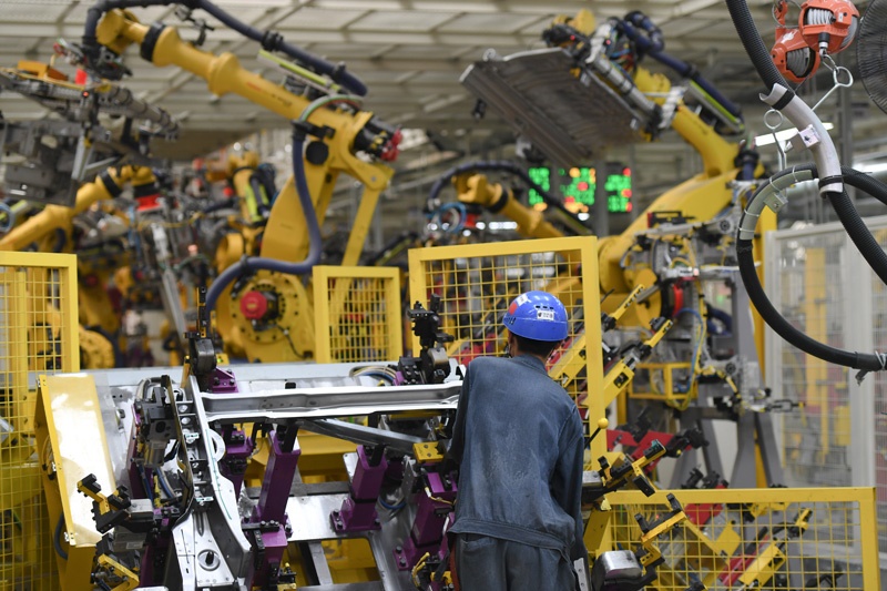 △2020年9月15日,在上汽集團乘用車寧德基地車身車間,工人操作機器人分拼汽車板材。