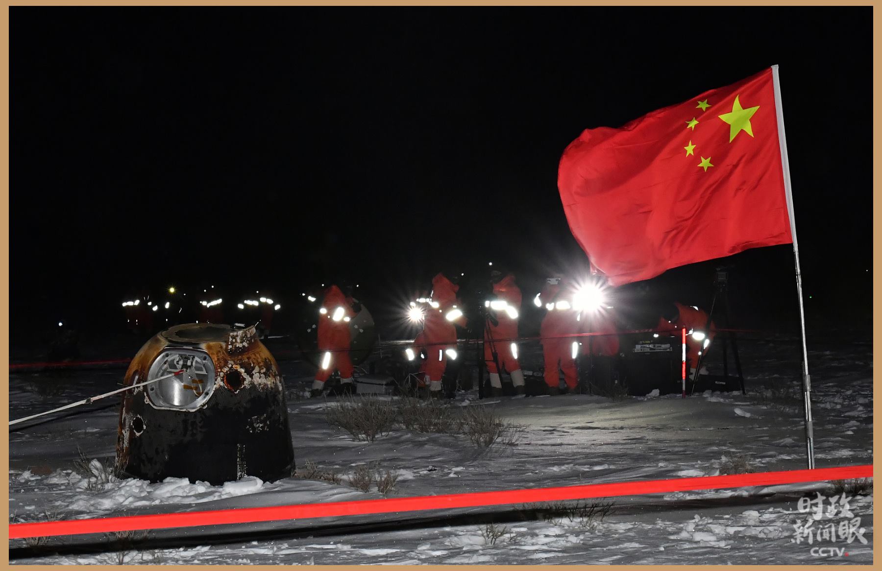 △2020年12月17日凌晨,嫦娥五號返回器攜帶月球樣品,在內(nèi)蒙古四子王旗預(yù)定區(qū)域安全著陸。